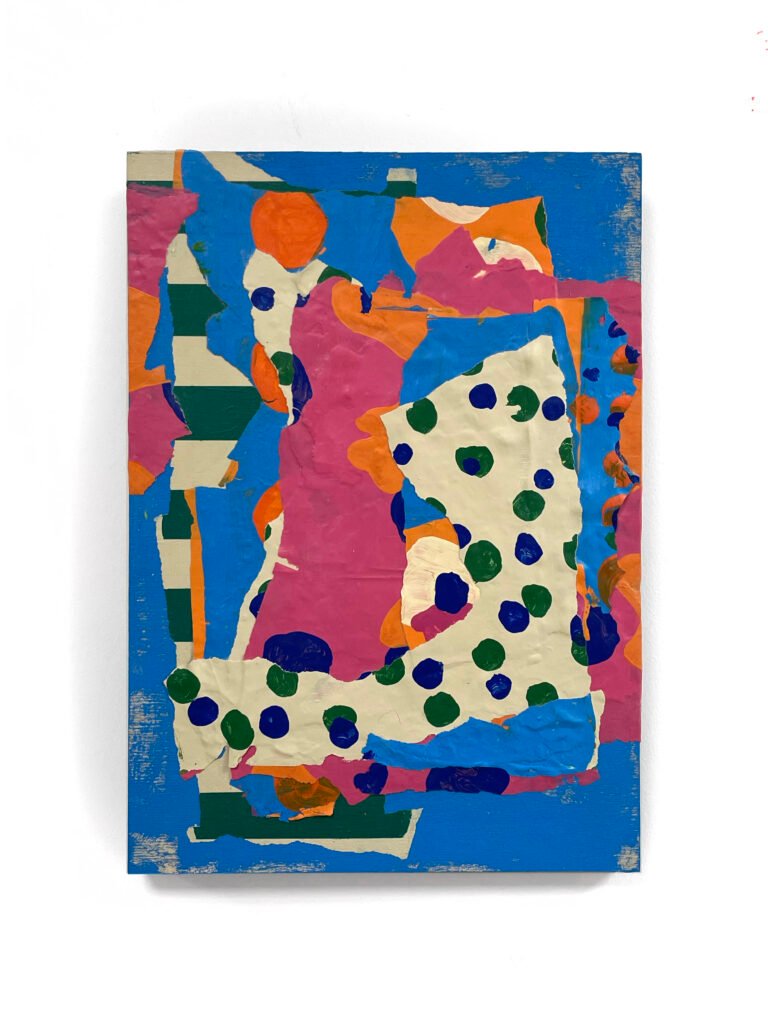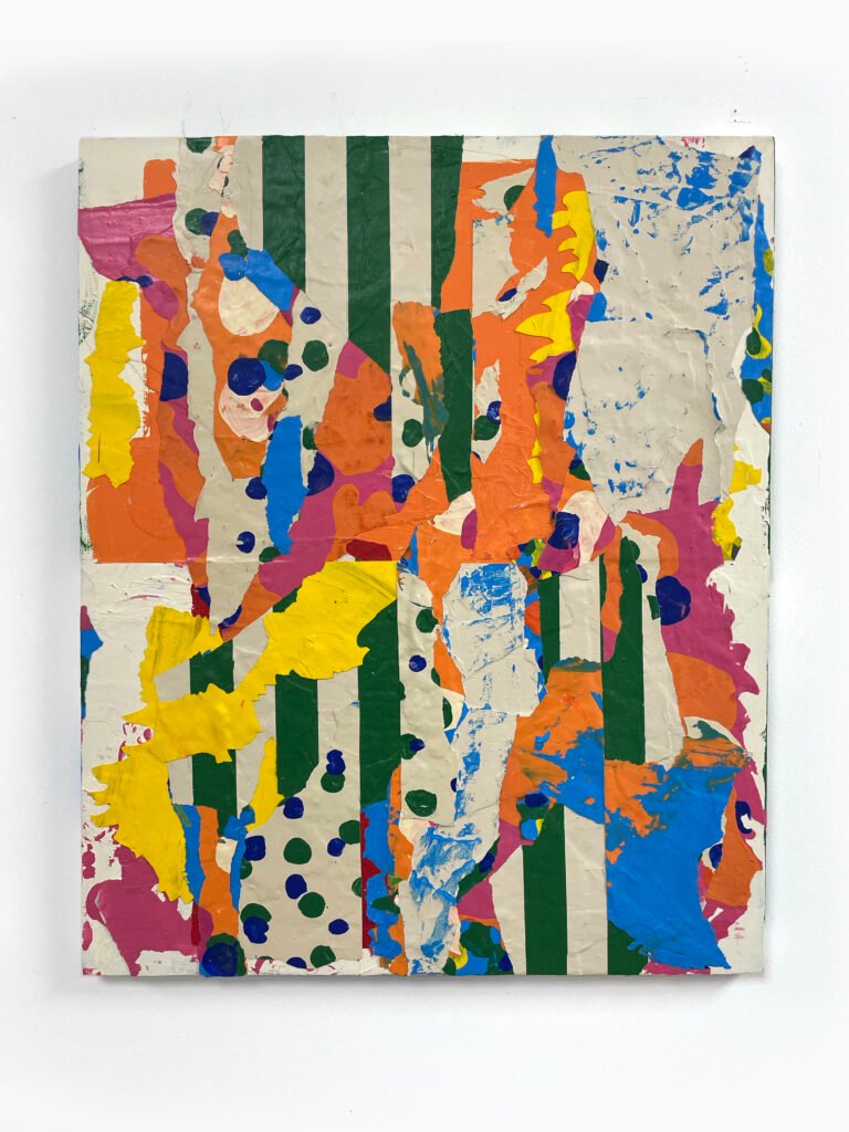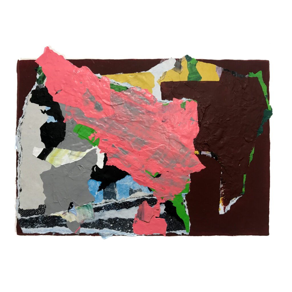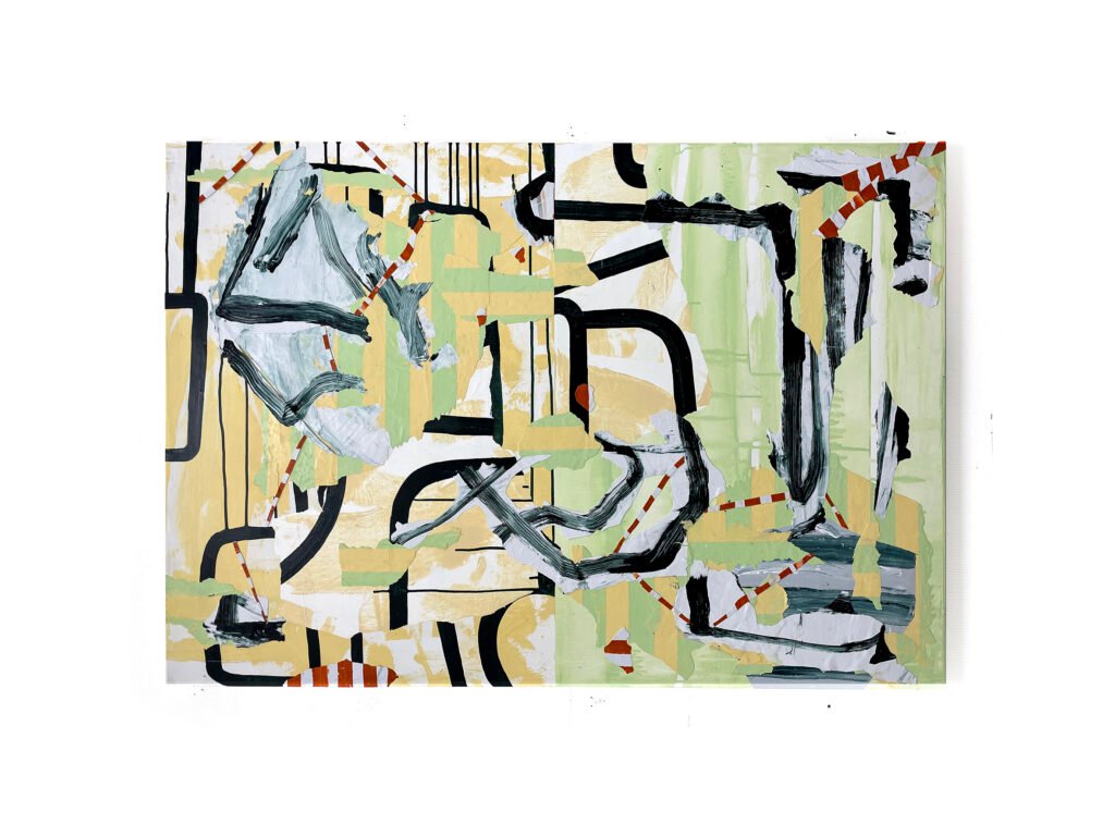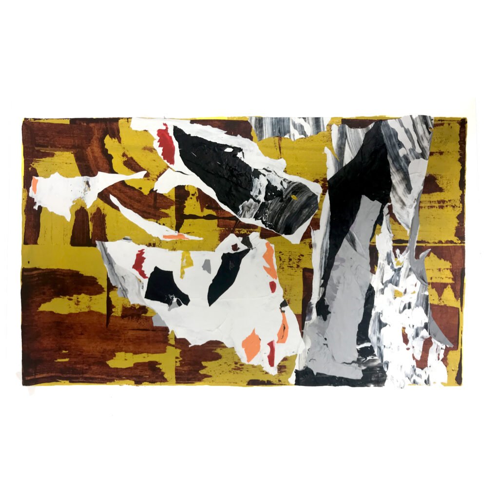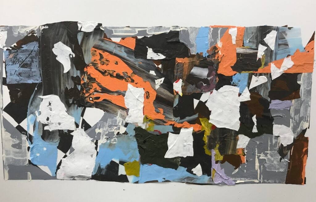 The work has evolved from both an interest in surface pattern and also painting as a subject matter in its own right. Paintings often explore pattern and abstract shapes and forms found throughout the city on hoardings, torn and decayed billboards and peeled and layered graffiti as a starting point for compositional decisions and the application of motifs. Paint is applied by layering torn and shredded acrylic paint skins onto a variety of painted surfaces.